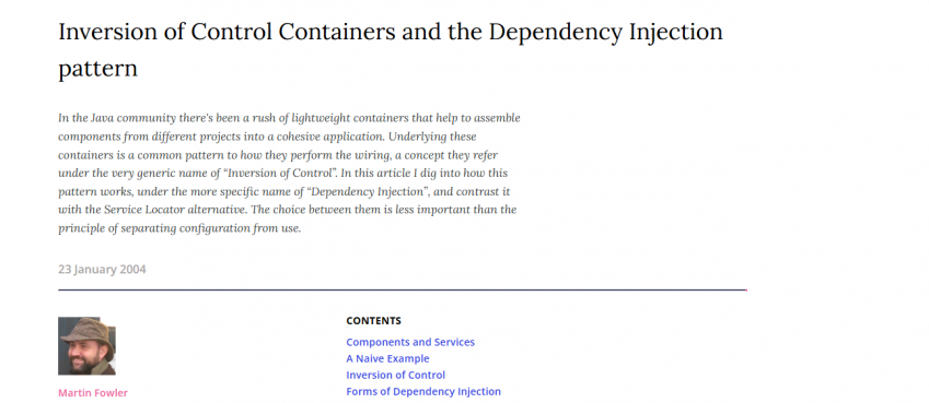 In this essay, he organizes the various forms of IoC and defines the concept of Dependency Injection (DI) as one specific pattern within IoC.