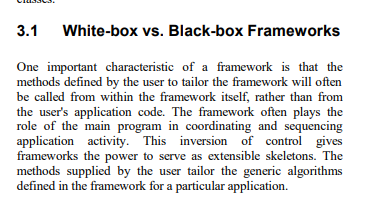 This paper is considered one of the works that established the concept of the modern framework, and it describes IoC as follows: unlike a library that application code calls directly, a framework itself operates by calling methods defined by the user.