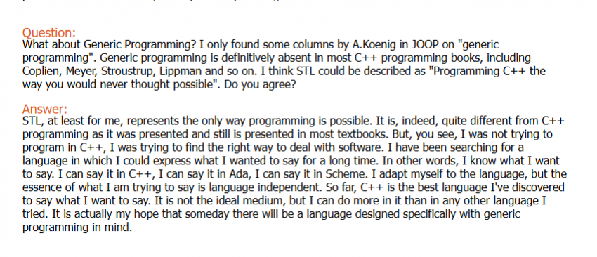 STL, at least for me, represents the only way programming is possible. It is, indeed, quite different from C++ programming as it was presented and still is presented in most textbooks. But, you see, I was not trying to program in C++, I was trying to find the right way to deal with software. I have been searching for a language in which I could express what I wanted to say for a long time. In other words, I know what I want to say. I can say it in C++, I can say it in Ada, I can say it in Scheme. I adapt myself to the language, but the essence of what I am trying to say is language independent. So far, C++ is the best language I’ve discovered to say what I want to say. It is not the ideal medium, but I can do more in it than in any other language I tried. It is actually my hope that someday there will be a language designed specifically with generic programming in mind.