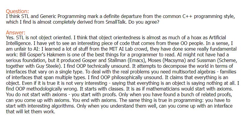 Yes. STL is not object oriented. I think that object orientedness is almost as much of a hoax as Artificial Intelligence. I have yet to see an interesting piece of code that comes from these OO people. In a sense, I am unfair to AI: I learned a lot of stuff from the MIT AI Lab crowd, they have done some really fundamental work: Bill Gosper’s HAKMEM is one of the best things for a programmer to read. AI might not have had a serious foundation, but it produced Gosper and Stallman (Emacs), Moses (Macsyma) and Sussman (Scheme, together with Guy Steele). I find OOP technically unsound. It attempts to decompose the world in terms of interfaces that vary on a single type. To deal with the real problems you need multistoried algebras—families of interfaces that span multiple types. I find OOP philosophically unsound. It claims that everything is an object. Even if it is true it is not very interesting—saying that everything is an object is saying nothing at all. I find OOP methodologically wrong. It starts with classes. It is as if mathematicians would start with axioms. You do not start with axioms—you start with proofs. Only when you have found a bunch of related proofs, can you come up with axioms. You end with axioms. The same thing is true in programming: you have to start with interesting algorithms. Only when you understand them well, can you come up with an interface that will let them work.