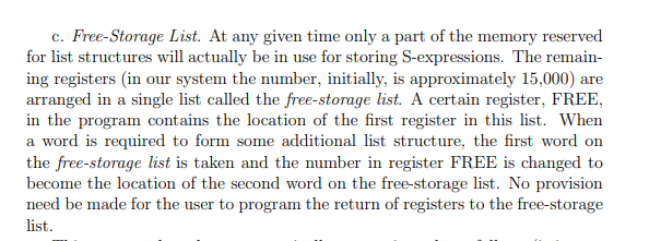*Free-Storage List.* At any given time only a part of the memory reserved for list structures will actually be in use for storing S-expressions. The remaining registers (in our system the number, initially, is approximately 15,000) are arranged in a single list called the *free-storage list*. A certain register, FREE, in the program contains the location of the first register in this list. When a word is required to form some additional list structure, the first word on the *free-storage list* is taken and the number in register FREE is changed to become the location of the second word on the free-storage list. No provision need be made for the user to program the return of registers to the free-storage list.