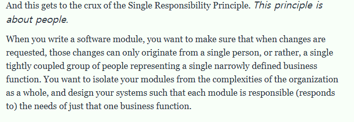 - "A class should have only one responsibility." In other words, a class should have only one reason to change.