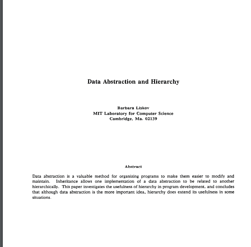 L - Liskov Substitution Principle (LSP) | Subtypes must be substitutable for their base types. | Barbara Liskov (1987) |