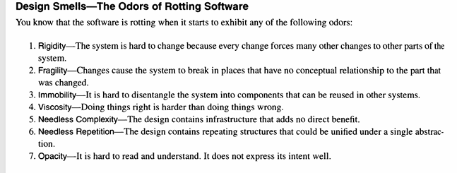 Rather than describing bad design in abstract terms, Martin classified it by the symptoms that actually appear in code. He called these Design Smells. A smell does not kill a system immediately, but left unaddressed, it causes rot. He identified four major smells.