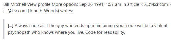 "Always code as if the guy who ends up maintaining your code will be a violent psychopath who knows where you live" is not simply a warning to write readable code.