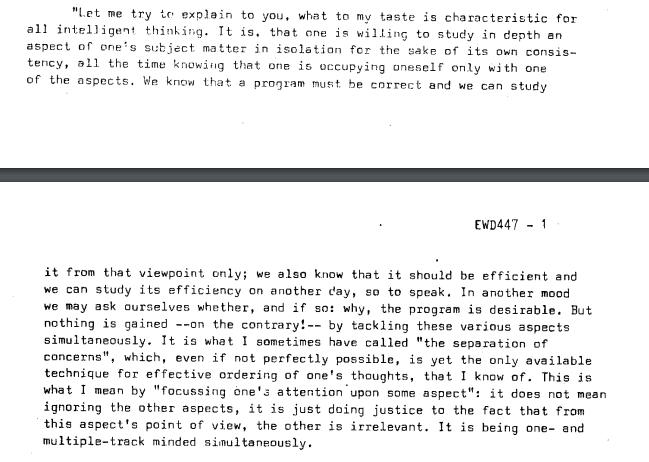"Let me try to explain to you, what to my taste is characteristic for all intelligent thinking. It is, that one is willing to study in depth an aspect of one's subject matter in isolation for the sake of its own consistency, all the time knowing that one is occupying oneself only with one of the aspects. We know that a program must be correct and we can study it from that viewpoint only; we also know that it should be efficient and we can study its efficiency on another day, so to speak. In another mood we may ask ourselves whether, and if so: why, the program is desirable. But nothing is gained --on the contrary!-- by tackling these various aspects simultaneously. It is what I sometimes have called "the separation of concerns", which, even if not perfectly possible, is yet the only available technique for effective ordering of one's thoughts, that I know of. This is what I mean by "focussing one's attention upon some aspect": it does not mean ignoring the other aspects, it is just doing justice to the fact that from this aspect's point of view, the other is irrelevant. It is being one- and multiple-track minded simultaneously.