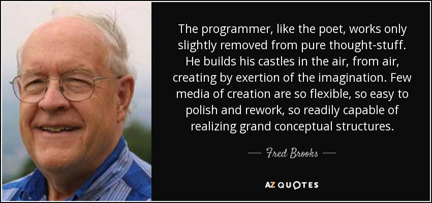 프로그래머는 허공에, 상상력의 힘으로 허공의 성을 짓는다."- 프레더릭 P. 브룩스 주니어, 『맨먼스 신화: 소프트웨어 공학에 대한 에세이』