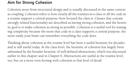 응집도는 복잡성을 관리하는 데 유용한 도구인데, 클래스 내의 코드가 중심 목적을 더 많이 지원할수록 뇌가 해당 코드가 수행하는 모든 작업을 더 쉽게 기억할 수 있기 때문입니다. 루틴 수준에서의 응집성에 대한 사고는 수십 년 동안 유용한 경험적 방법이었으며 오늘날에도 여전히 유용합니다. 클래스 수준에서는 응집성의 경험적 방법이 이 장의 앞부분과 6장에서 논의된 더 넓은 경험적 방법인 잘 정의된 추상화에 의해 크게 포괄되었습니다.