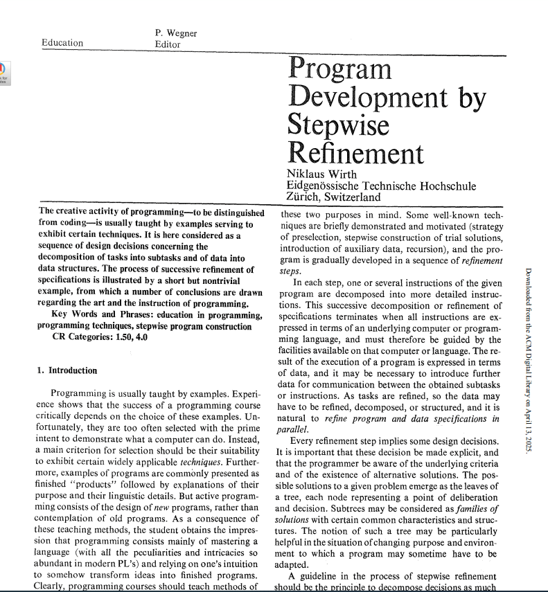 1971년 니클라우스 비르트(Niklaus Wirth)는 모듈화를 점진적 정제(Stepwise Refinement)과정으로 설명했다.