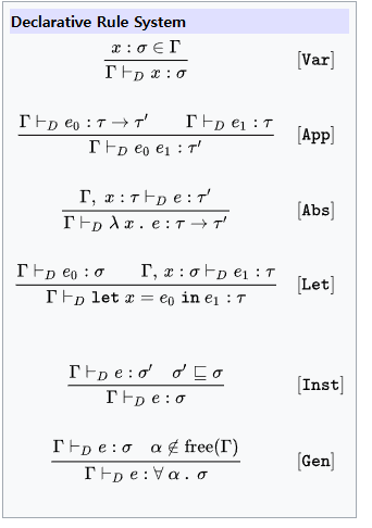 위의 식은 힌들리 미너 타입 시스템의 선언적 타입 시스템을 나타내고, 타입 판별 및 타입 유추 규칙을 나타낸 것이다.