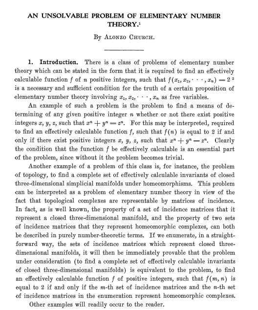 -알론조 처치 An Unsolvable Problem of Elementary Number Theory(1936)