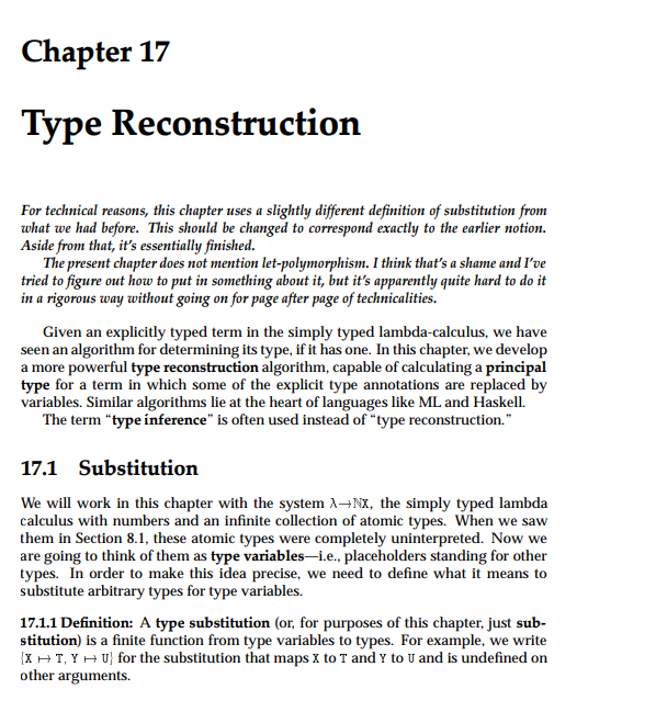 Types and Programming Languages에서는 타입 재구성(Type Reconstruction)이라는 파트로 나오며, 타입 추론(Type Inference)이라는 단어와 혼용된다고 한다. 두 용어의 차이는 다음과 같다.