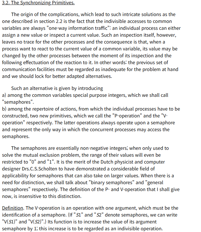 세마포어는 본질적으로 음수가 아닌 정수입니다. 상호 배제(Mutual Exclusion) 문제를 해결하는 데만 사용될 경우, 그 값의 범위는 "0"과 "1"로 제한될 수도 있습니다. 더 큰 값도 가질 수 있는 세마포의 광범위한 적용 가능성을 입증한 것은 네덜란드의 물리학자이자 컴퓨터 설계자인 C.S. Scholten 박사의 공로입니다. 필요에 따라 구분할 때, 우리는 이를 각각 "이진 세마포어(binary semaphores)"와 "일반 세마포어(general semaphores)"라고 부를 것입니다. 이제부터 제가 제시할 P-연산과 V-연산의 정의는 이러한 구분에 영향을 받지 않습니다.