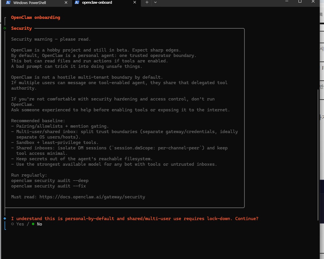14.10 온보딩 보안 경고에서 자동으로 No가 선택됨
