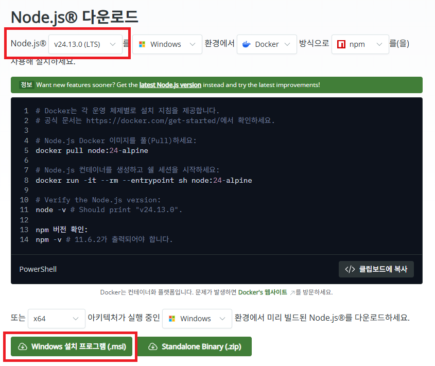 아직 없다면 공식 사이트에서 LTS 버전을 받는다.