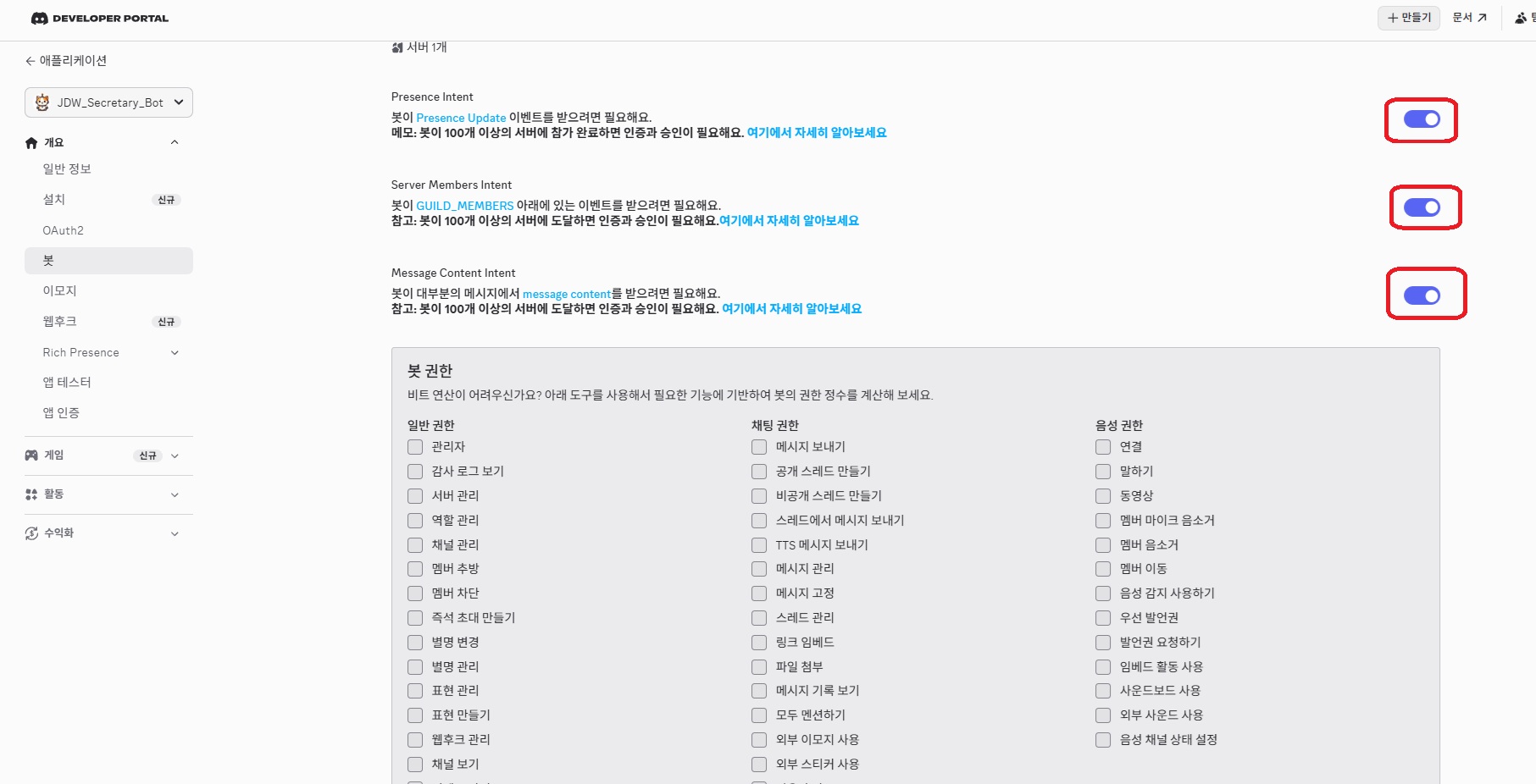 스크롤하여 Privileged Gateway Intents 섹션에서 세 개 모두 ON: