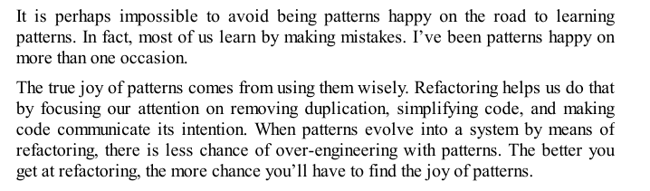 패턴이 리팩토링을 통해 시스템 속으로 자연스럽게 녹아들 때, 패턴을 과도하게 사용하는 과잉 설계의 위험은 줄어듭니다.